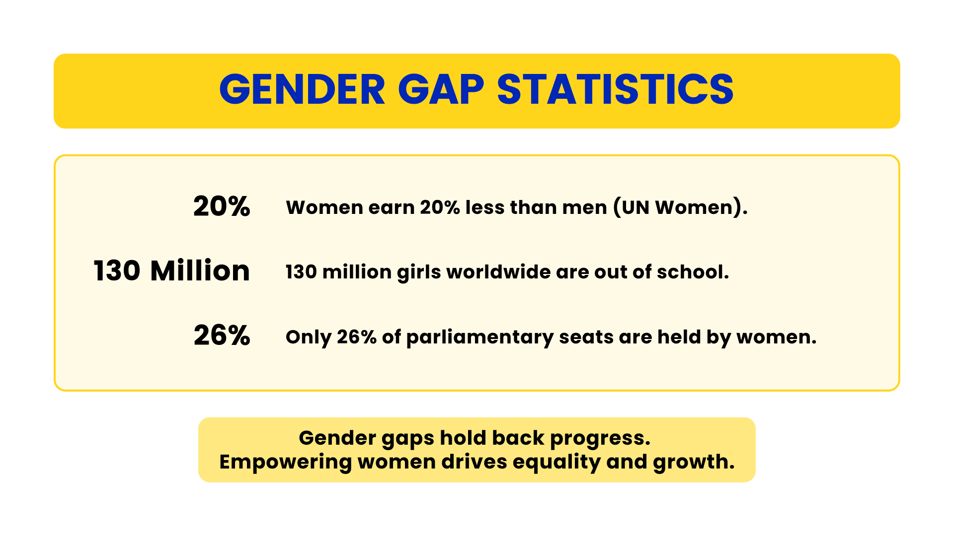 According to UN Women, women are paid 20% less than men on average, and nearly 130 million girls are still out of school. This lack of opportunity limits not only individual growth but also the overall progress of society.